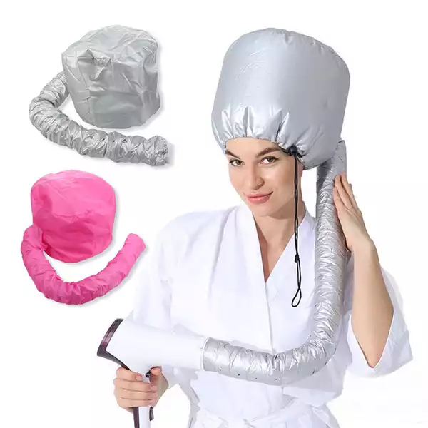 Mũ hấp tóc dùng máy sấy nóng làm bằng chất vải dù không thấm nước, có dây rút điều chỉnh theo kích cỡ đầu mỗi người.